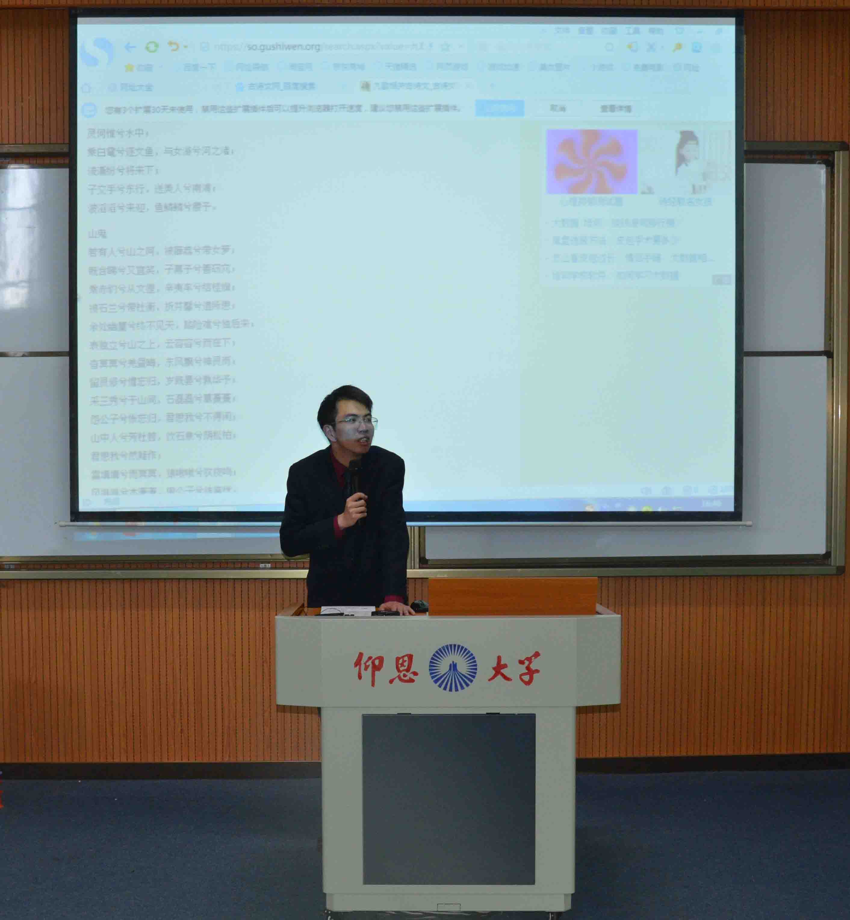 中文系汪钰老师作为特邀嘉宾从专业的角度为我们解读本次决赛的两首曲目《山鬼》和《地道战》。山鬼出自屈原的作品《九哥·山鬼》,汪老师解释山鬼即山神,并且把整篇作品分为三个部分,指出第一部分是迎接山神,情感是庄重的,第二部分和第三部分是山神的内心独白,第二部分的情感是深情的,而到了第三部分的情感是凄凉和绝望的。作品表面上是山神对爱情的执着、坚贞,更深层次的理解是屈原对理想的追求、对祖国的挚爱。同时,汪老师结合自己所观看过的《红色娘子军》来讲解《地道战》,认为他们有异曲同工之处,认为《地道战》要唱的铿锵有力,避免因为我们女生多处理的过于柔和,同时分析了地道战和正面战场的不同之处,认为地道战更为灵活,而且在感情上不同于正面战场的雄伟悲壮,更加突出的应该是革命乐观主义。汪老师希望通过这样解读,让同学们在唱歌的过程中对情感和节奏有更准确的把握,能够表演的更加到位。
