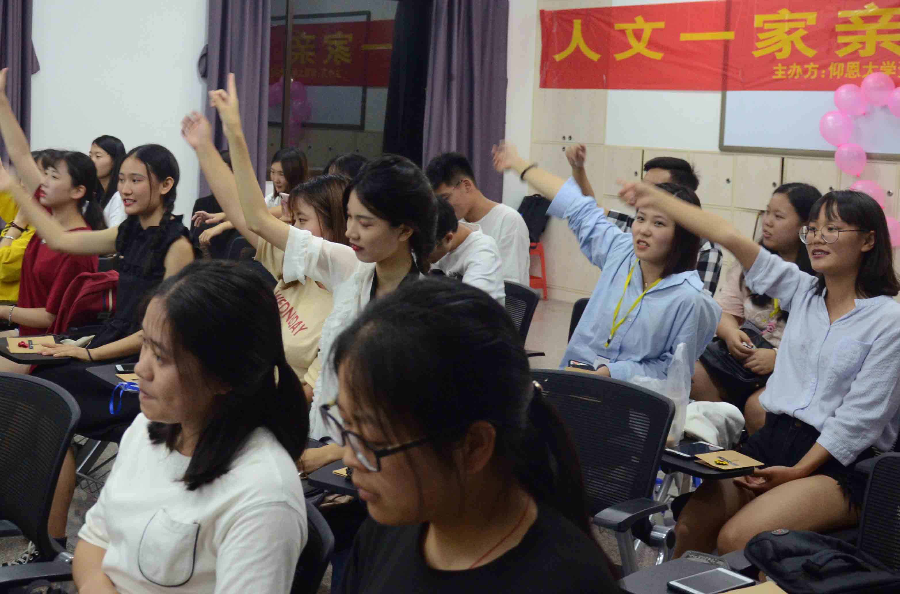 胡友仁老师发表讲话 晚会以学生会文艺部的成员带来的《江南+eiei》拉开序幕,他们以甜美的歌声和矫健的舞姿,赢得大家的喝彩。紧接着,凌乐健带来一曲《消愁》,用他独特的嗓音勾起了大家无限的回忆,使得双手不自觉的跟着节拍摇摆。让人意想不到的是刘巧玫、陈峰、朱婷、李少聪和林志荣老师,身着“人文2018”的服装走上台,为大家带来了一曲《明天会更好》以甜美的歌声充分展现了人文风采以及对未来的美好憧憬。现场闪光灯在同学们的手中纷纷亮起跟着摇摆,仿佛自己置身星海。最激动人心的游戏环节是“击鼓传花”,接到花球的同学们接受惩罚,纷纷上台表演才艺,李少聪老师以一首《小幸运》震惊全场。朱婷老师和曹流老师深情演唱了一首《后来》,赢得了热烈的掌声和呐喊声。“心有灵犀”这个游戏环节更是有趣,胡友仁等老师也参与其中,他们的语言和肢体表达赢得了场下阵阵笑声。在“给你真挚祝福”这个环节,大家纷纷在小卡片上为陌生人写下寄语,通过随机抽取的方式将自己的祝福传递出去。最后,此次晚会以一首全体成员深情演唱的《感恩的心》完美落幕。