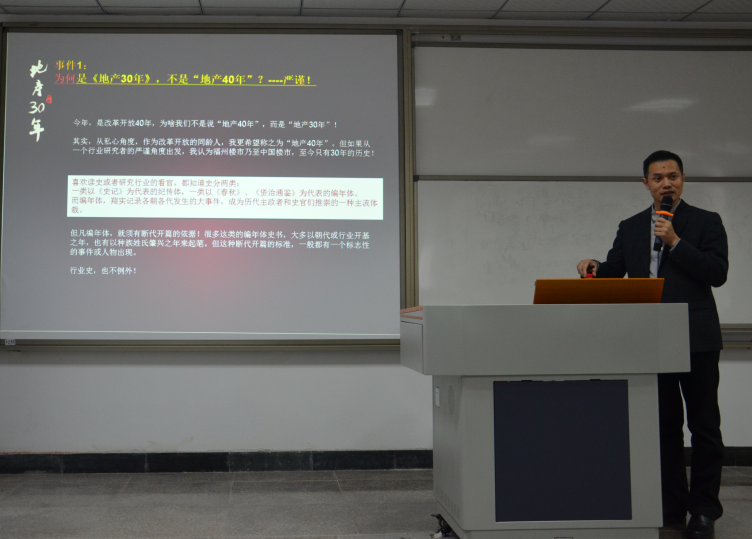 宣讲会上,叶先生通过地产媒体案例,生动幽默地与听众交流从事新闻工作的经验。在16年地产媒体从业经验的基础上,他所著的《地产30年》,被业界誉为“中国楼市30年发展史上的情怀巨作”。他告诫学弟学妹们,作为行业观察者,不能人云亦云,需要有建设性的观点。在大学期间,叶先生的文笔出众。在他看来,为文是很苦,但也不是在社会上没有一席之地;他坚信,只要找到自己的支点,不但可以撬动地球,还可以有普通生意人没有的成就。
