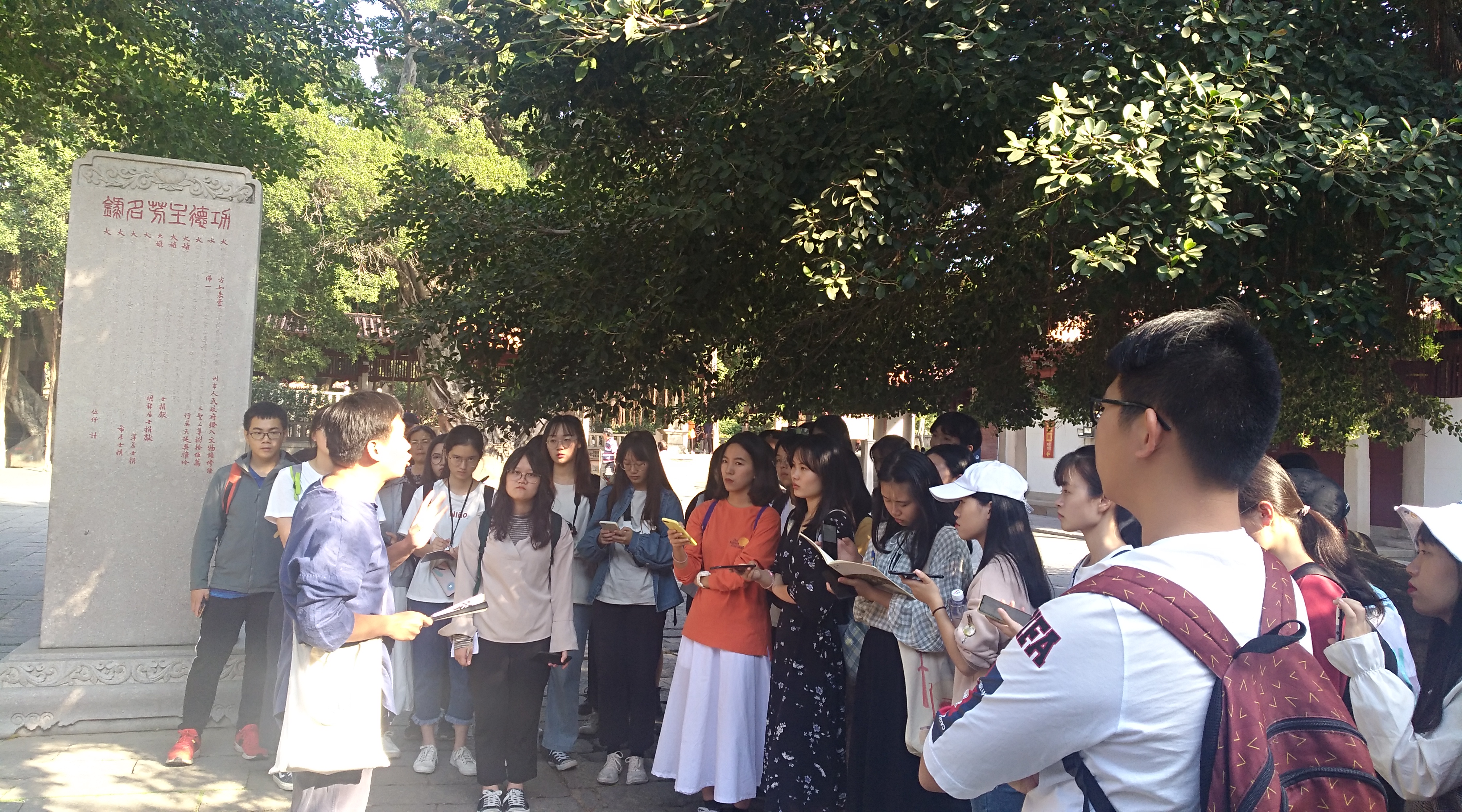 活动现场 从开元寺门口的“紫云屏”到东塔的佛传故事“丘井狂象”,李以健老师用轻松欢快的语调、幽默诙谐的表达,穿插00后大学生熟知的热门影视剧,活灵活现地向同学们讲述了开元寺的起源、宗教的多元融合、闽南文化的特色以及深藏于历史背后的精彩故事。