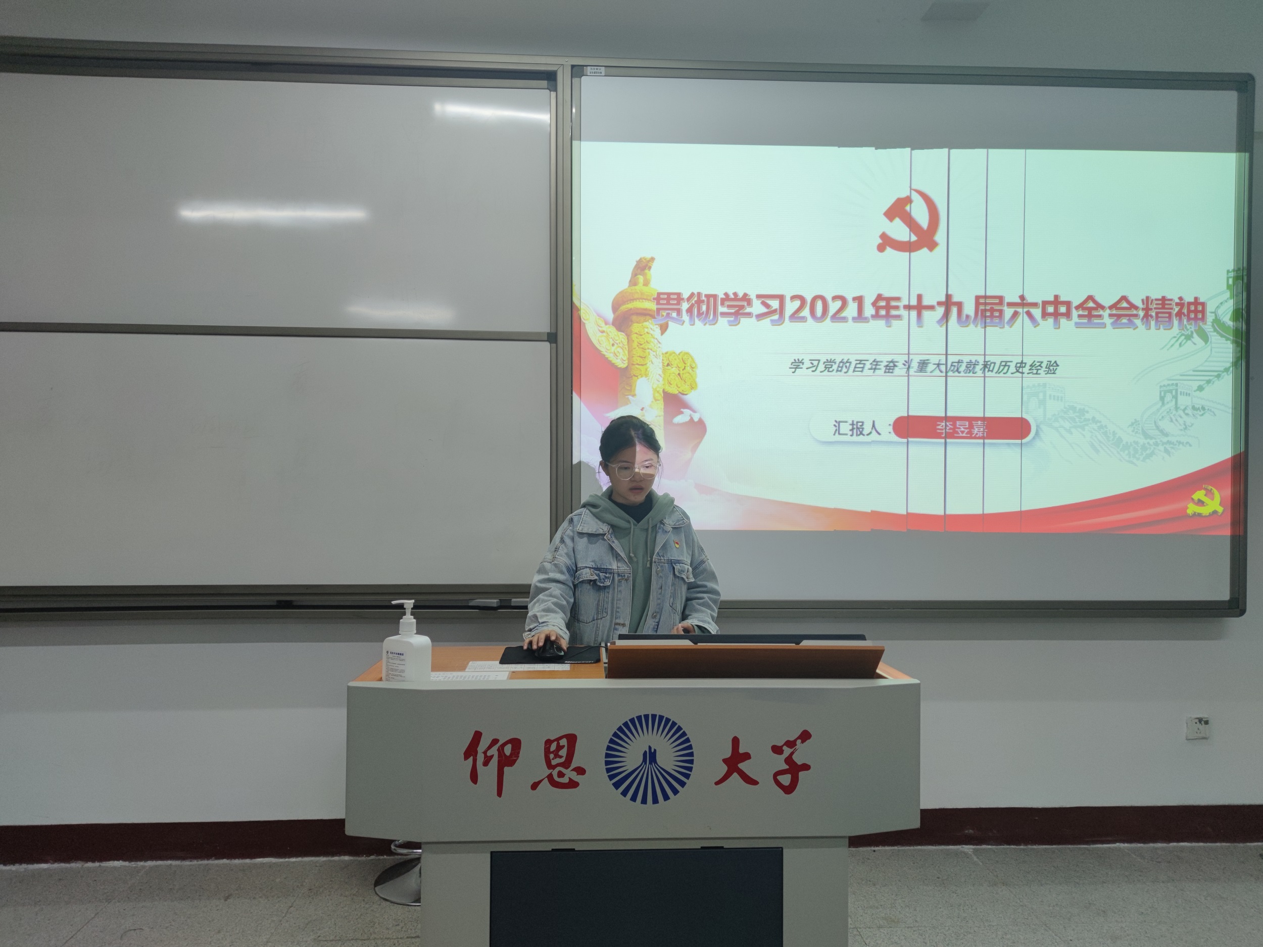 随后,李昱嘉同志也从十九届六中全会会议介绍、党的百年奋斗的重大成就、党的百年奋斗的历史经验、不忘初心实现第二个百年奋斗目标的新的赶考四个方面进行汇报分享。分享内容中说到:中国共产党立志于中华民族千秋伟业,百年恰是风华正茂。过去一百年,党向人民、历史交出了一份优异的答卷。现在,党团结带领中国人民又踏上了实现第二个百年奋斗目标的新的赶考之路。时代是出卷人,我们是答卷人,人民是阅卷人,我们一定要继续考个好成绩,在新时代新征程上展现新气象、新作为。
