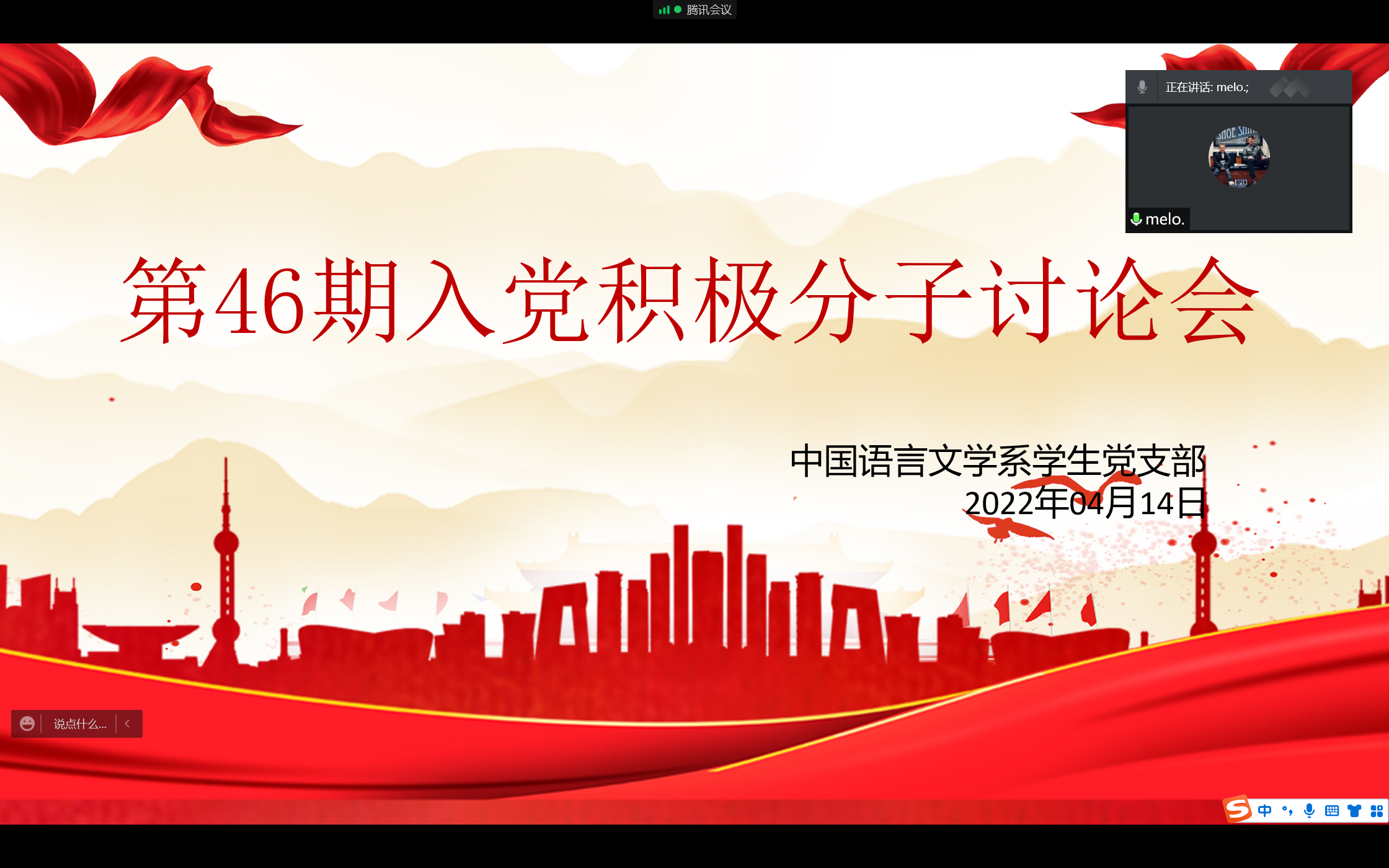 4月14日16:00,受疫情影响,中国语言文学系学生党支部于线上召开了第46期入党积极分子讨论会。邵梓隽老师出席本次讨论会。