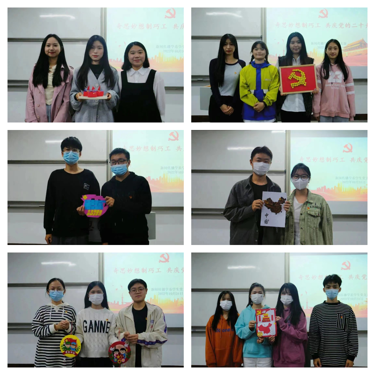 作品展示 最后,新闻系支部书记曾璐对本次党日活动做总结,新闻支部的党员同志们以创意手工庆祝二十大胜利召开,感受到了同志们青春献礼的热情以及务实的作风。望新闻支部全体党员同志,从党的重大成就和历史经验中增长智慧,增强信心,肩负起责任,贯彻落实好党的二十大精神。(李绚、林琳欣/图文)