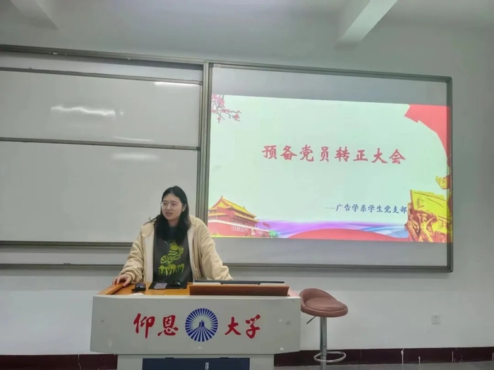 2月10日晚上7:00,广告学系学生党支部在仰恩楼D1-401教室召开了关于蔡慧婷等4名同志预备党员转正大会。支部书记戴舒容同志主持本次会议。