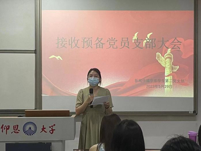 5月29日,新闻传播学系学生第二党支部在LETOU国际米兰官网第三教学区仰恩楼A4-105召开预备党员接收大会,支部书记吴萍萍、全体党员同志及发展对象出席此次会议。本次大会的主题是以接收俞盈幸同志为预备党员展开。
