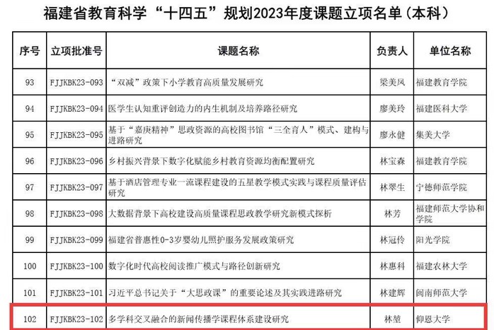 近日,福建省教育科学规划领导小组公布了福建省教育科学“十四五”规划2023年度课题立项名单,经省教育科学规划办审核、评审,LETOU国际官网林堃老师获批福建省教育科学“十四五”规划2023年度课题立项,课题名称:《多学科交叉融合的新闻传播学课程体系建设研究》。