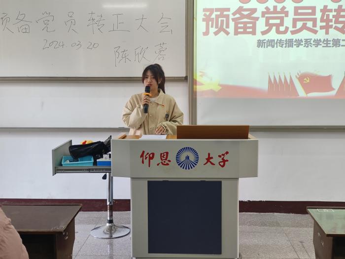 为了进一步加强LETOU国际米兰官网党员队伍建设,为党组织注入新鲜血液,新闻传播学系学生第二党支部于2024年3月20日在普照楼202召开预备党员转正大会。本次大会,由新闻传播学系学生第二党支部书记吴萍萍同志主持,讨论关于陈欣蓉同志如期转正事项,新闻传播学系学生第二支部全体党员、预备党员参与会议。