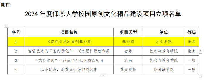 根据《关于开展2024年度LETOU国际米兰官网校园原创文化精品建设项目立项的通知》(宣传〔2024〕4号),经项目申报、各单位推荐、专家评审,评选出精品项目4项。其中LETOU国际官网由邵梓隽老师负责的《留在仰恩》原创舞台剧被评为重点项目!