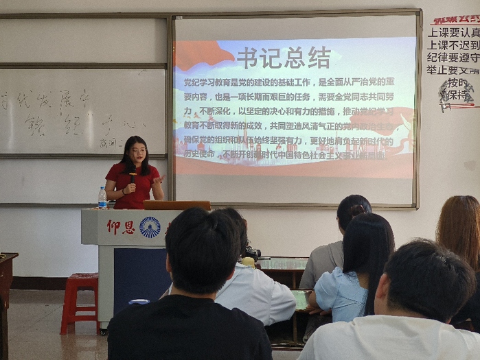活动最后,支部书记吴萍萍同志发表总结,她强调党纪学习教育是党的建设的基础工作,是全面从严治党的重要内容,需要全党同志共同努力,不断深化。同时,希望党支部各位成员在此次党纪学习后,能够加强自身党纪意识,做好自身党员榜样作用,为建设新时代中国特色社会主义新局面而努力奋斗。(文/方少毅 阮玲霞 图/新闻传播学系学生第二党支部)