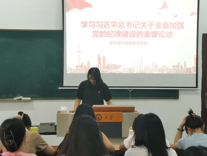 6月19日上午,中文专升本学生党支部在祥贤楼306召开“学习习近平总书记关于全面加强党的纪律建设的重要论述”专题研讨会,本次研讨会由支部书记施晓渝老师主持,支部全体党员同志参与此次活动。