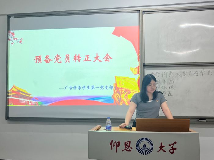 2024年6月19日下午,广告学系学生第一党支部于普照楼307召开预备党员转正大会。本次会议由支部书记戴舒容老师主持,讨论关于戴思怡、黄依琳、袁家鑫3位预备党员的转正事项,支部全体党员参与会议。