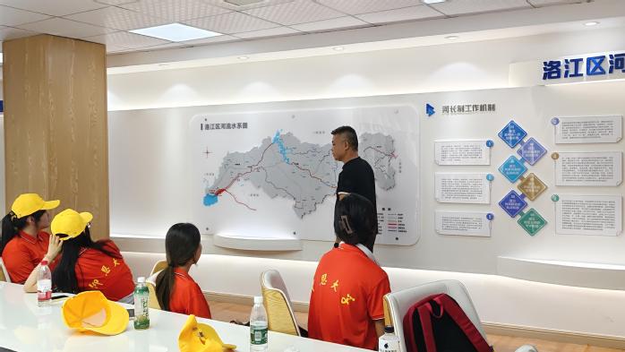 在洛江区河长制智慧指挥中心,曾主任详细介绍了洛江区河流的基本概况,并对河长制的组织架构和运作模式进行了深入讲解。此外,实践队还共同观看了有关爱河护河行动的宣传视频,进一步提高了对河长制工作重要性的认识。