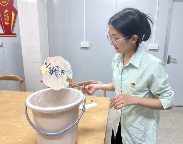 最后,在党务助理的组织下大家开始手工漂漆团扇。党员们先将喜爱的颜料滴于水面,用工具轻划出合适的图案,再把团扇轻轻覆于水面,颜料附着后拿起晾干。