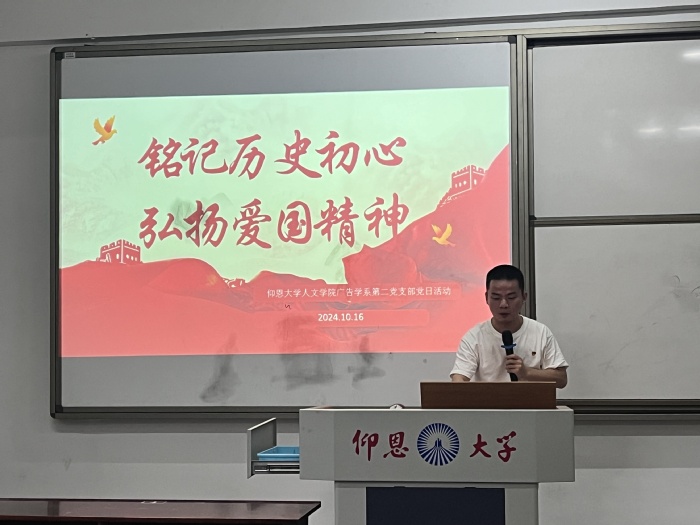 2024年10月16日下午5点,广告学系学生第二党支部在普照楼309开展了以“铭记历史初心,弘扬爱国精神”为主题的党日活动。
