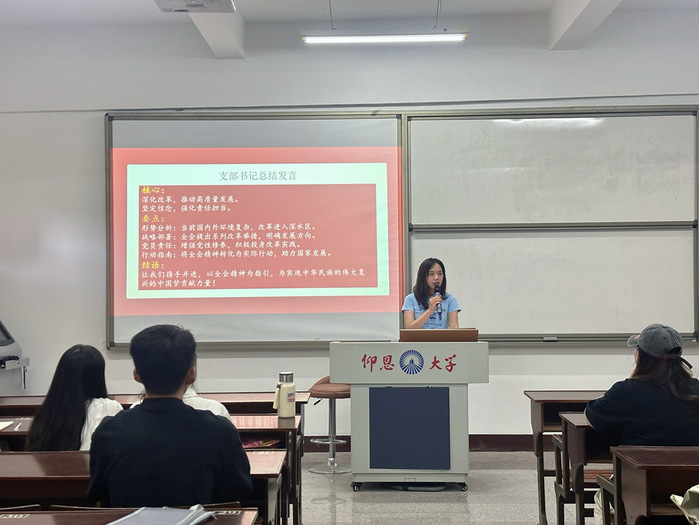 10月23日下午16:00,广告学系学生第二党支部于第三教学区普照楼311教室举行了“学习党的二十届三中全会精神”主题党课活动。此次活动由党支部主讲人李林翔同志主持,旨在引领支部党员深入领会并把握全面深化改革的重大意义。