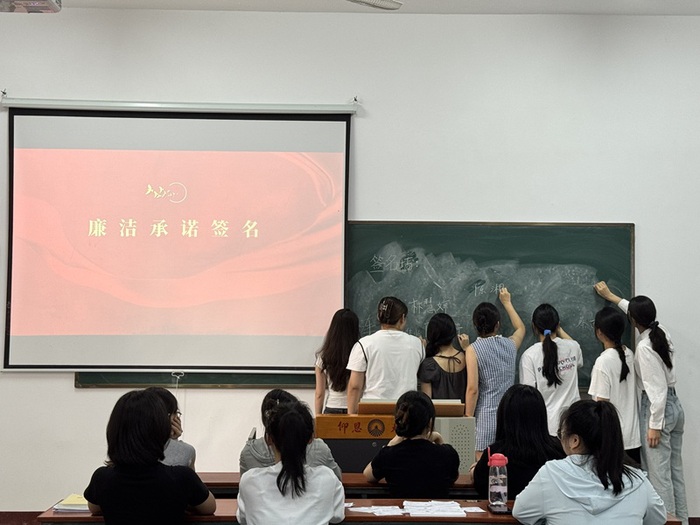理论学习后,现场气氛庄重而热烈。在一面“廉洁从教承诺墙”前,与会学生党员神情肃穆,逐一郑重签下自己的姓名。每一笔签名,不仅是对廉洁自律的庄严承诺,更是对践行中央八项规定精神、坚守初心的铿锵誓言。这面承载着责任与决心的承诺墙,无声地提醒每一位学生党员时刻自重、自省、自警、自励,将廉洁意识内化于心、外化于行。
