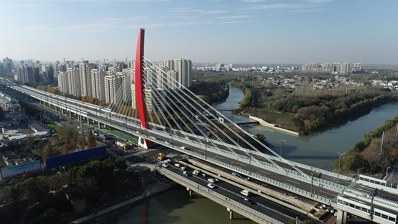 包公大道4标作为全线施工难度最大的标段,其重难点施工为跨店埠河斜拉桥,该桥采用跨径152+84m独塔单索非对称钢-混混合梁,主塔高度97.3m,塔柱立面为月牙形,下塔柱为圆形镂空结构,意为“包公故里,日月同辉”,其建成后将成为肥东县又一座标志性建筑。主塔自去年8月建设以来,安徽交建项目全体人员以只争朝夕的精神状态和真抓实干的奋斗姿态,克服施工技术难点,严把关键工序,应用变曲线钢筋分段预制、钢木组合模板、制作索导管精平定位装置等多项新技术,平稳快速推进施工进度。在各级单位和相关领导的关心和大力支持下,项目历经470多天的奋力鏖战,最终迎来主线桥的建成通车,比建设工期缩短了8个月。
