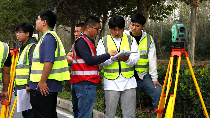 次日上午,在安徽交建大连路项目竣工封闭路段,学员早已准备充分、跃跃欲试。在“全站仪对点赛”和“水准+导线”技能竞赛,导师互换小组以裁判的身份进行全程跟踪,依据各组完成时间、操作规范性、测量结果以及第一天的理论成绩综合评判最终结果。