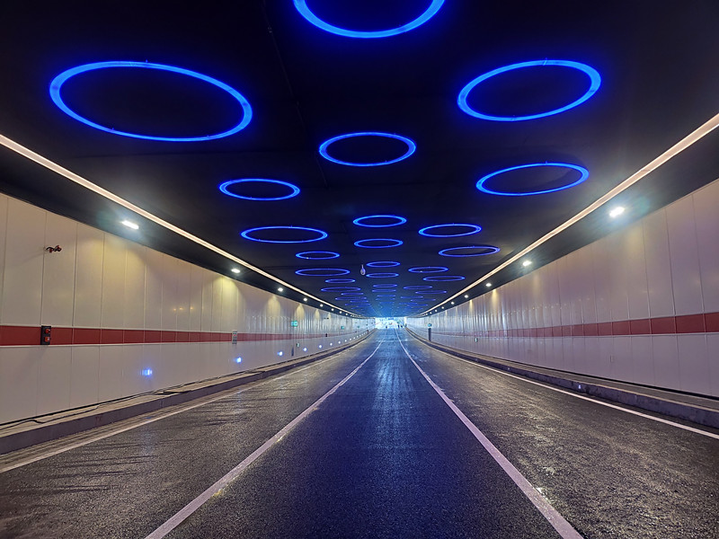 在隧道装修方面,入口设置形如天鹅展翅遮光棚,改善进出隧道行车视线;隧道内白墙黑顶,红色腰线伸向远处,内顶镶嵌圆形LED灯饰,如湖底映射的一个个蓝色涟漪。